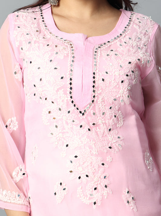 Experience the true essence of Lucknowi Chikan work with our beautifully crafted Chikankari Hand Embroidered Soft Georgette Calf-Length Kurti